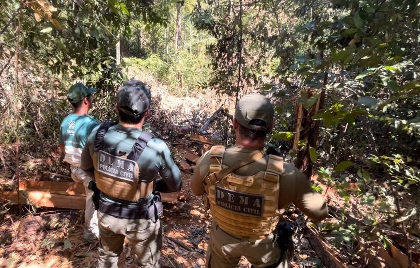 A ação fiscalizatória constatou danos ambientais e furto de madeira na propriedade rural. Durante a investigação, com base em uma denúncia recebida pela Dema, os policiais observaram que os suspeitos entraram na fazenda e realizaram a derrubada e corte de árvores em área de preservação permanente, e depois furtaram a madeira do local.