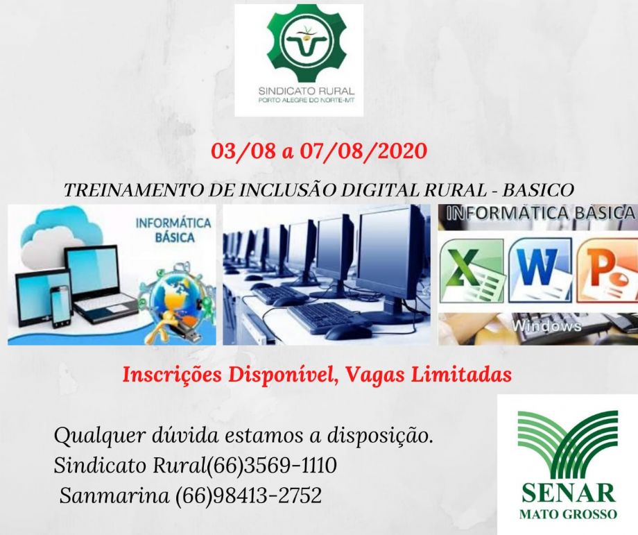 Sindicato Rural de Porto Alegre do Norte trará treinamento de “Inclusão digital rural”.