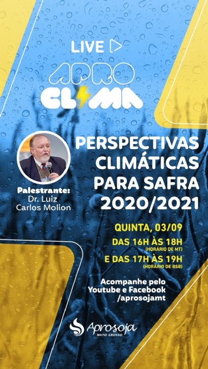 As perspectivas climáticas para a safra 2020/2021 será tema da terceira live da Associação dos Produtores de Soja e Milho de Mato Grosso (Aprosoja-MT), promovida pelo Projeto AproClima. O encontro será na quinta-feira (03.09), das 16h às 18h (horário de MT), em formato de palestra com o professor PhD em Meteorologia pela Universidade de Wisconsin (EUA), Luiz Carlos Molion.