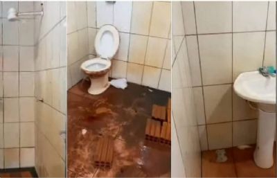 Além do excesso de sujeira e presença de tijolos sobre o piso do banheiro, no momento de acionamento da descarga do vazo a mulher mostra na filmagem a água retornando pelo ralo para o piso do local.