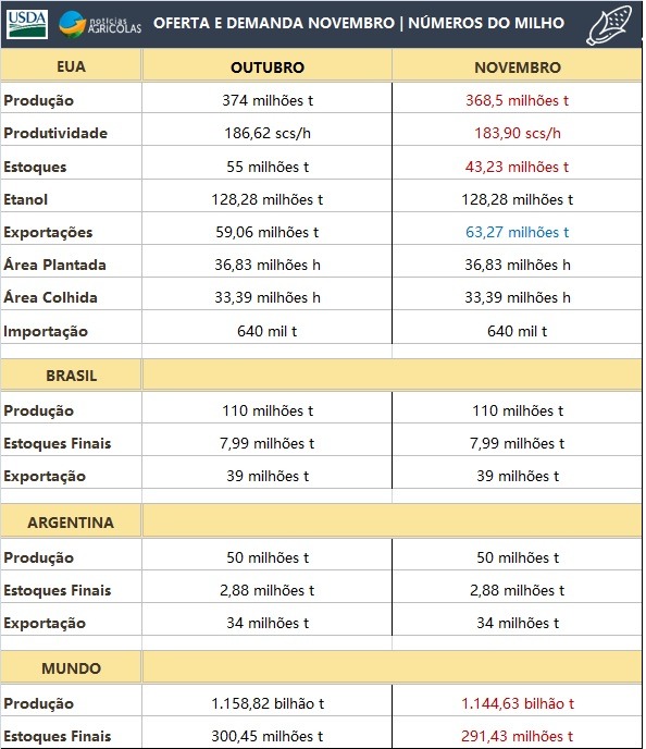 As expectativas médias do mercado eram de, respectivamente, 115,96 milhões de toneladas, 57,83 sacas por hectare e 6,4 milhões de toneladas. MILHO EUA