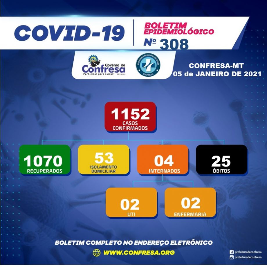 Confresa conta atualmente com 1140 casos confirmados, destes 42 encontram-se em isolamento domiciliar, 03 internados e 25 óbitos confirmados.