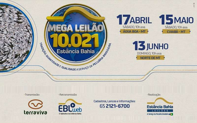 O Mega Leilão da Estância Bahia, edição Água Boa, será realizado dia 17 de abril na modalidade virtual. “ Assim, como foi no ano passado, vamos repetir o formato e seguir rigorosamente as recomendações das autoridades para evitar aglomeração das pessoas”. Maurício Tonhá.