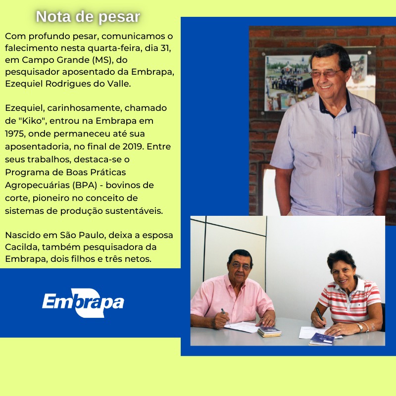Morreu nesta quarta-feira (31) Ezequiel Rodrigues do Valle, pesquisador aposentado da Unidade Gado de Corte da Empresa Brasileira de Pesquisa Agropecuária (Embrapa) e um dos criadores e principal difusor do protocolo e da cartilha das Boas Práticas Agropecuárias (BPA). Do Valle deixa esposa Cacilda, também pesquisadora da Embrapa, dois filhos e três netos.