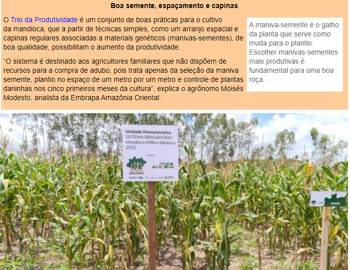 No local, os resultados do projeto Mandiotec, executado pela Embrapa Amazônia Oriental e financiado pelo BNDES, por meio do Fundo Amazônia, mostram que com tecnologias simples, boas práticas de manejo e a capacitação de comunitários e técnicos, é possível produzir mais e melhor na mesma área, por vários anos consecutivos, garantindo mais segurança alimentar, renda e menos pressão ao meio ambiente.