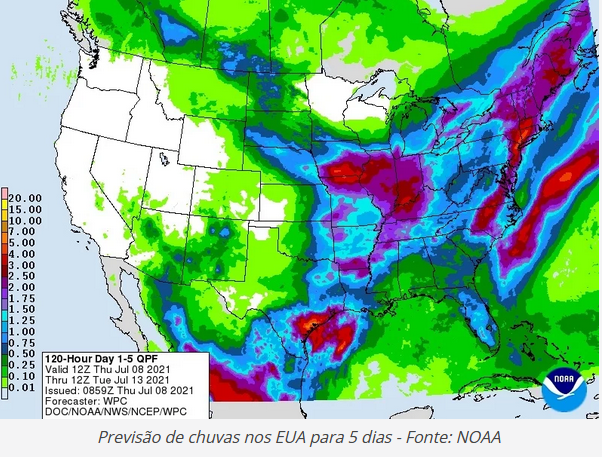 Abaixo, a previsão do NOAA para 8 a 13 de julho mostra que partes do norte de Minnesota e Wisconsin ainda deverão ficar sem chuvas (nas áreas em branco no extremo norte dos EUA), enquanto Illinois, Indiana e partes de Iowa e Missouri deverão receber precipitações mais intensas (nas áreas coloridas em roxo e vermelho).