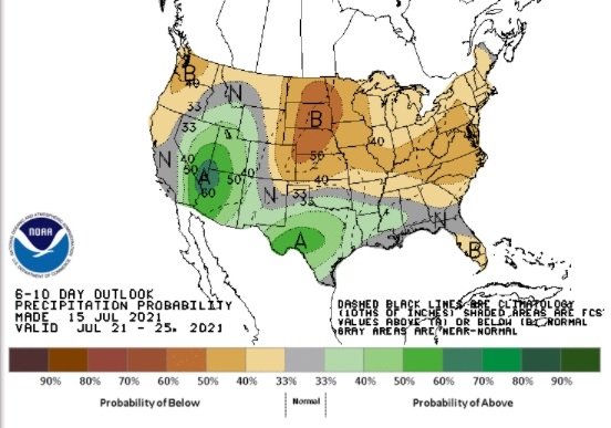 Os mapas abaixo, do NOAA, o serviço oficial de clima dos EUA, mostram as condições esperadas para o período de 21 a 25 de julho para as precipitações e, na sequência, as temperaturas.