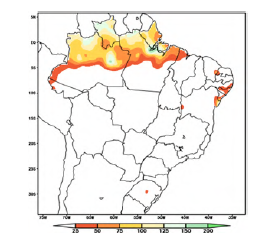 No restante do país não foram registradas chuvas, exceto por pequenas áreas no oeste da Bahia e Rio Grande do Norte, leste do Ceará e centro do Rio Grande do Sul. Veja a figura 1.