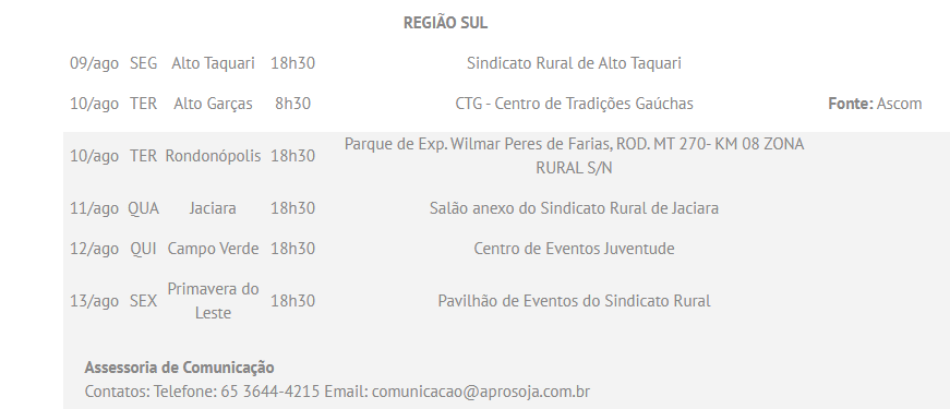Após a região Sul, o Circuito Aprosoja segue para as regiões Oeste e Leste. O encerramento será no Buffet Leila Malouf, em Cuiabá, no dia 13 de setembro, às 19h.