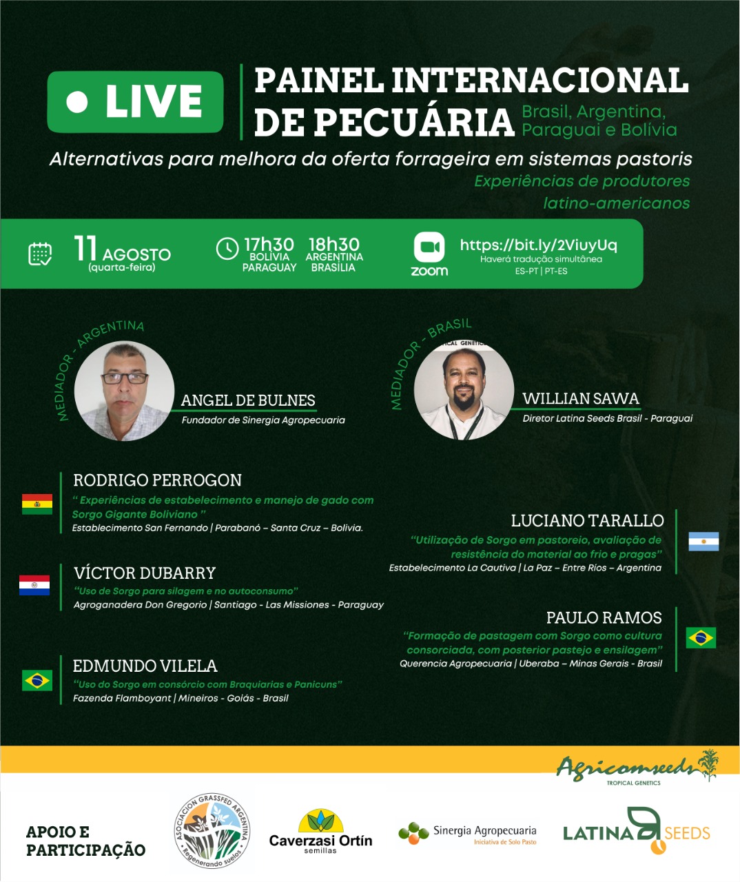 Com o objetivo de disseminar as alternativas encontradas por pecuaristas da Argentina, Paraguai, Bolívia e Brasil, um pool de empresas e organizações realiza, no próximo dia 11 de agosto (próxima quarta-feira), o Painel Internacional de Pecuária com o tema “Alternativas para a melhora da oferta forrageira em sistemas pastoris”. O evento acontecerá a partir das 18h30min (horário de Brasília), via Internet, com tradução espanhol/português e português/espanhol, pela plataforma Zoom (acesso via https://bit.ly/2ViuyUq).Do Brasil, participarão dois produtores. Edmundo Vilela (Fazenda Flamboyant, Mineiros, GO) falará sobre “Uso do sorgo em consórcio com braquiárias e Panicuns”, enquanto Paulo Eduardo Lazzarini Ramos (Fazenda Querência, Uberaba, MG) contará sobre sua experiência com a “Formação de pastagem com sorgo como cultura consorciada, com posterior pastejo e ensilagem”. Dos países vizinhos, mais três pecuaristas estão confirmados: Rodrigo Perrogon (Bolívia) com o tema “Experiências e manejo de gado com Sorgo Gigante Boliviano”; Víctor Dubarry (Paraguai) que falará sobre “Uso de sorgo para silagem e no autoconsumo” e Luciano Tarallo (Argentina), que apresentará detalhes sobre a “Utilização de sorgo em pastoreio, avaliação de resistência do material ao frio e às pragas”.