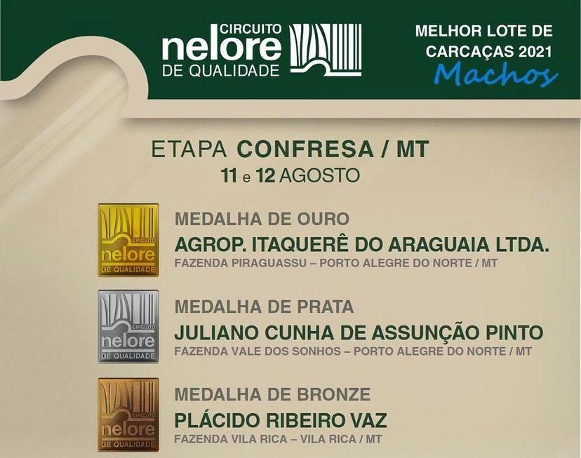 Em primeiro lugar, recebendo a medalha de ouro Fazenda Piraguassu – Grupo Itaquerê. Já para a segunda posição em medalha de prata Fazenda Vale dos Sonhos – Juliano Cunha ambas em Porto Alegre do Norte. Para o terceiro lugar em medalha de bronze Fazenda Vila Rica – Plácido Ribeiro Vaz, município de Vila Rica.