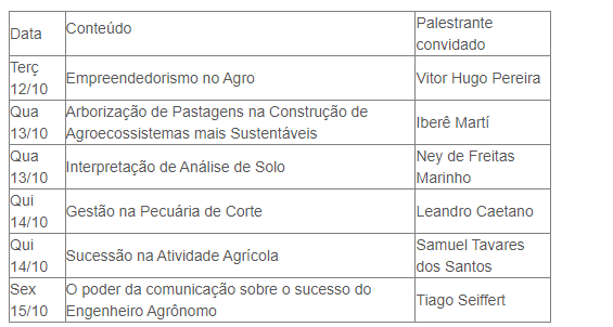 Em comemoração ao dia nacional do Engenheiro Agrônomo a Empresa Júnior Araguaia Xingu em conjunto com Instituto Federa de Educação, Ciências e Tecnologia de Mato Grosso - Campus Confresa e Repórter Agro, está promovendo um evento do dia 12 a 15 de outubro de 2021, abordando temas de interesse das diversas áreas do Agronegócio.
