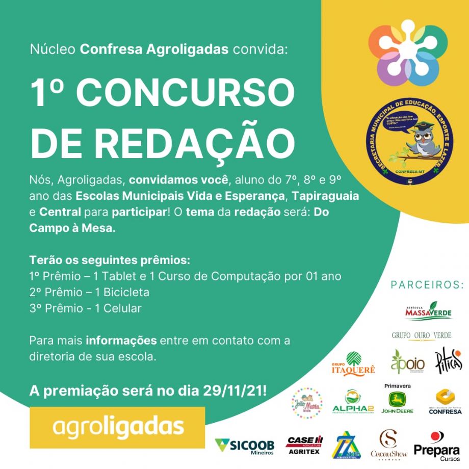 O 1º Concurso de Redação em Confresa, convidou alunos dos 7º,8º e 9º ano das Escolas Municipais Vida e Esperança, Tapiraguaia e Central para participar. O tema abordado pela redação foi “Do campo para a mesa”, uma forma de instigar a disseminação do agro para a população.