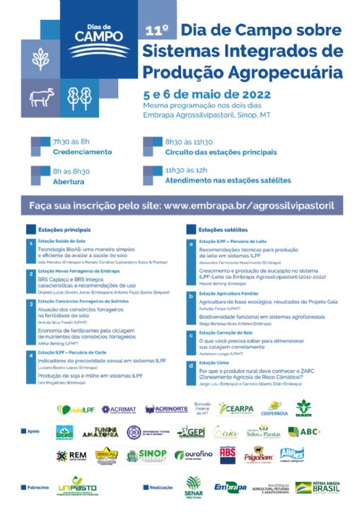 inscrições para o 11º Dia de Campo sobre Sistemas Integrados de Produção Agropecuária, que Embrapa e Senar-MT promovem nos dias 5 e 6 de maio, na Embrapa Agrossilvipastoril, em Sinop (MT). O evento retorna ao seu formato original após ter sido realizado de forma on-line em 2020 e ter sido cancelado em 2021.