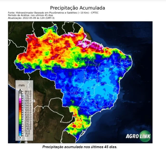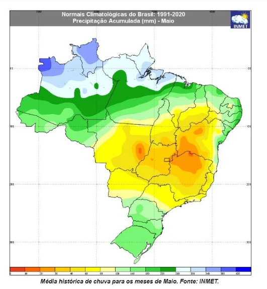 O mês de maio é caracterizado pelos baixos volumes pluviométricos esperados em uma ampla área da parcela central do país. Isso ocorre devido às mudanças nos padrões de circulação e nas massas de ar que atuam sobre o Brasil no período, cenário este que persiste até a entrada da primavera.