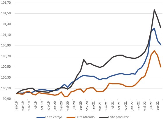 De janeiro/19 a outubro/22, o leite pago ao produtor aumentou 123,3%, no varejo 91,8% e no atacado 50,1%.