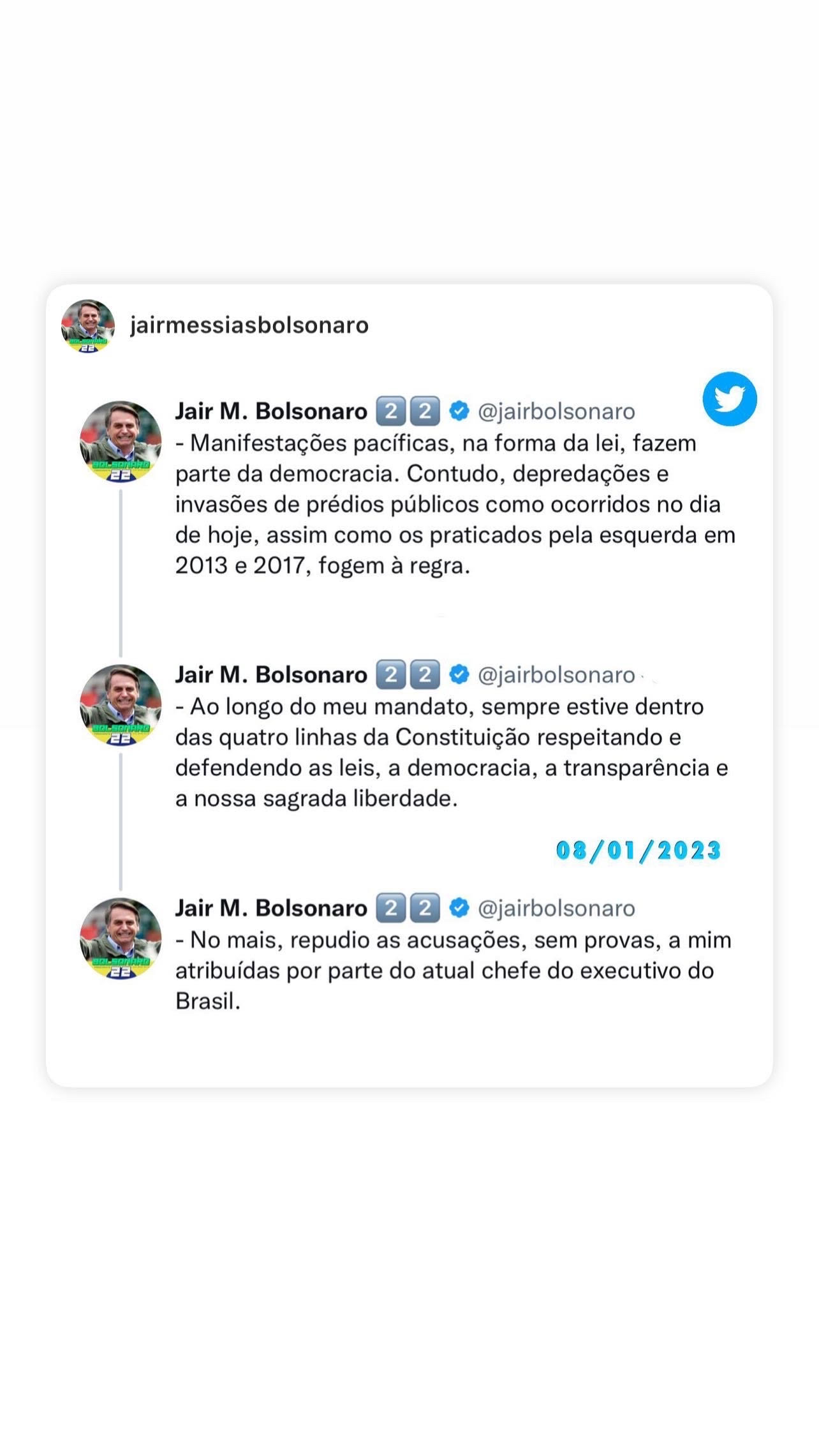 Durante a noite deste domingo, 8, o ex-presidente Jair Bolsonaro se pronunciou sobre a invasão ao Congresso Nacional, feita por um grupo de manifestantes que não aceita o resultado das eleições presidenciais. Em seu twitter, Bolsonaro disse que depredações e invasões de prédios não fazem parte da democracia e que ao longo de seu mandato sempre seguiu a Constituição “respeitando e defendendo as leis, a democracia, a transparência e a sagrada liberdade”.