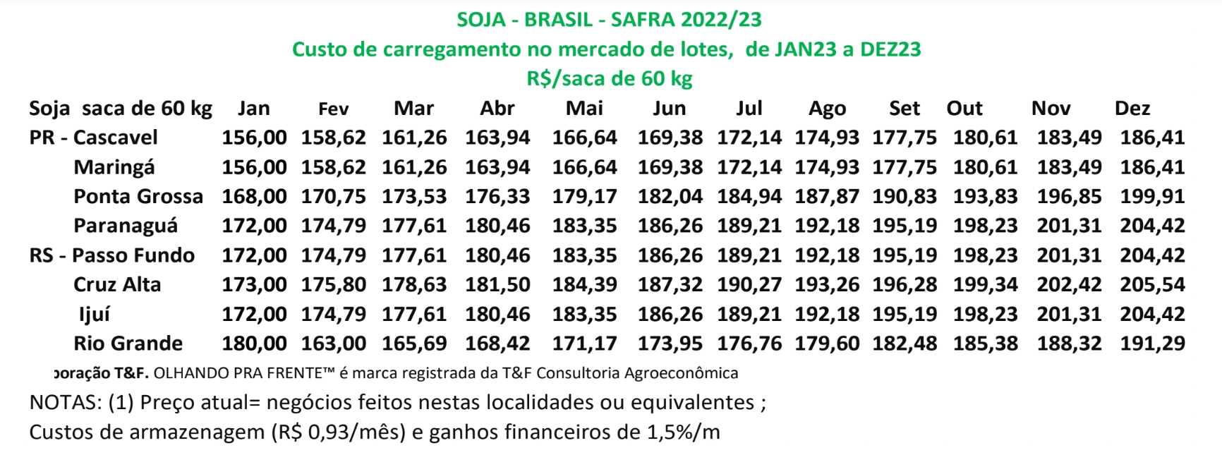 Olhando para a frente e examinando o preço pago pela oleaginosa no Brasil, destaca o analista sênior da TF, o quadro acima enumera os preços de hoje nas principais praças do Paraná e do Rio Grande do Sul. “Projetamos este mesmo preço até dezembro de 2023, com os custos de carregamento da posição. Não significa que os preços subiram, mas que foram corrigidos com os ganhos da redução da armazenagem e com os ganhos do mercado financeiro no período”, explica ele.