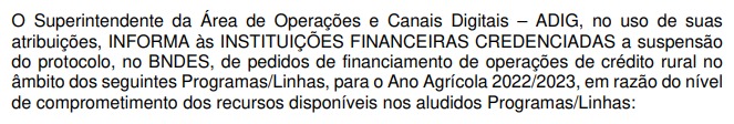 Como noticiado pelo jornal Valor Econômico, em comunicado aos bancos credenciados, e em seu próprio site, o BNDES informa a suspensão de onze linhas ou programas de crédito rural, entre elas: Pronaf, Pornamo, ABC+, PCA, Proirriga, Procap-Agro Giro, Inovagro e Moderfrota.
