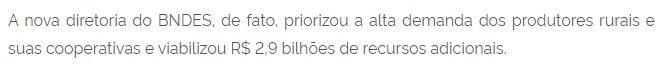 O BNDES alega falta de recursos disponíveis, um dia depois de anunciar um aporte de R$2,9 bilhões, mas não apresenta informações, de forma pública, de quanto já foi utilizado deste crédito relativo ao Plano Safra 2022/2023. Algumas dessas linhas haviam sido suspensas ainda em 2022, e foram retomadas no dia 1º de fevereiro de 2023, segundo comunicado do Banco ao jornal Valor Econômico.
