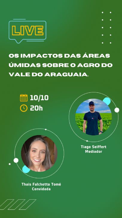 Nesta terça-feira, Tiago Seiffert recebe a Engenheira Florestal Thais Falchetto Tomé para desmistificação dos principais pontos de impacto das áreas úmidas sobre o agronegócio da região do Vale do Araguaia.