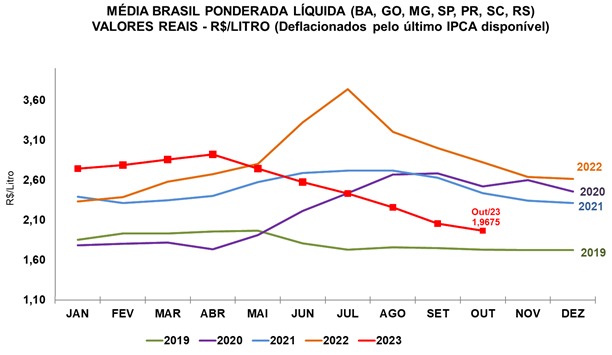 A expectativa dos agentes de mercado é de que o movimento de queda siga perdendo força nos próximos meses. A perspectiva de agentes consultados pelo Cepea é de que o preço do leite captado em novembro fique estável na Média Brasil. Algumas bacias leiteiras, contudo, podem até mesmo registrar valorização do leite, devido à menor captação, que, por sua vez, é prejudicada pelo clima adverso e pelo estreitamento da margem do pecuarista (que tende a diminuir os investimentos na atividade neste curto prazo).